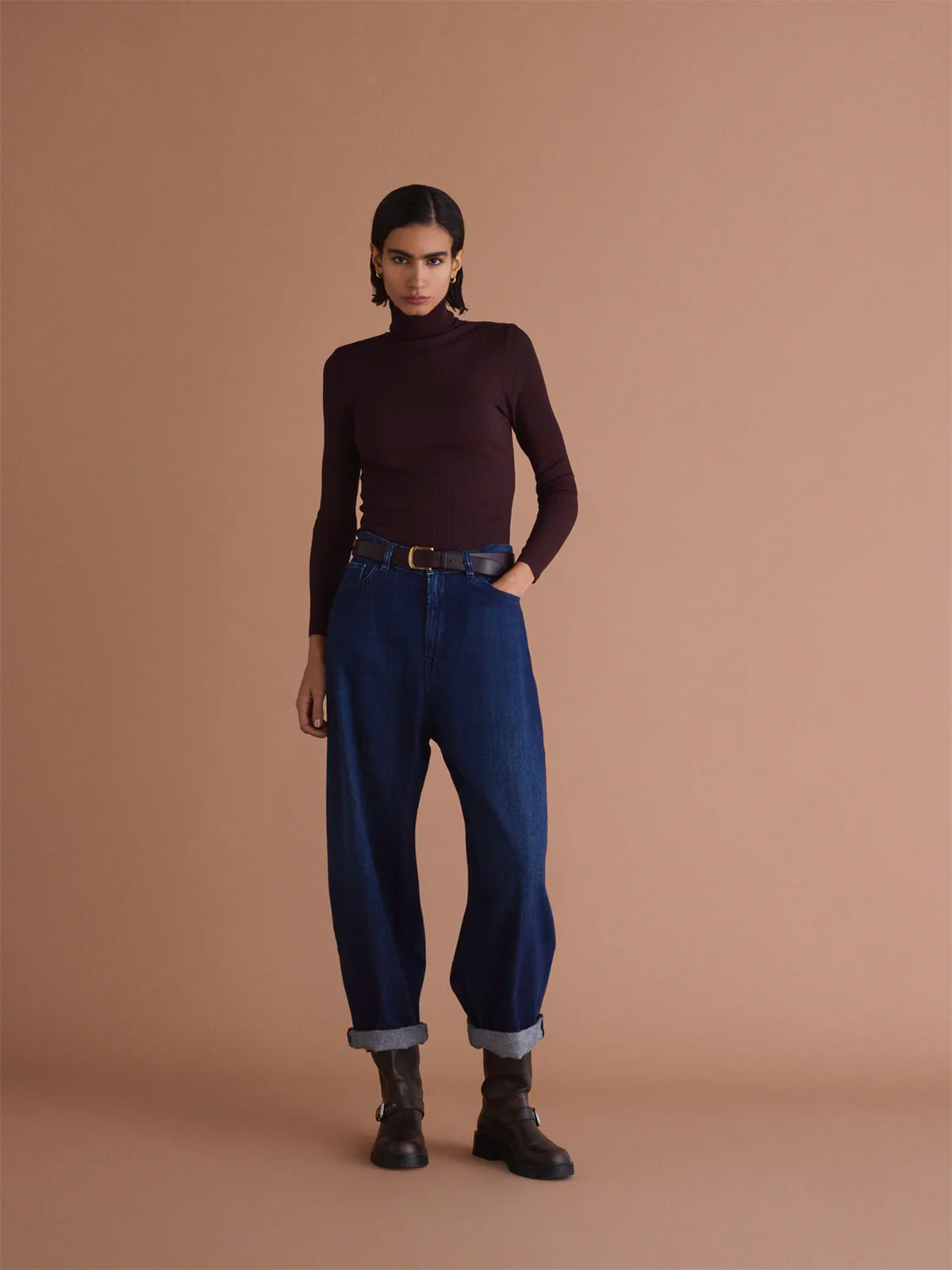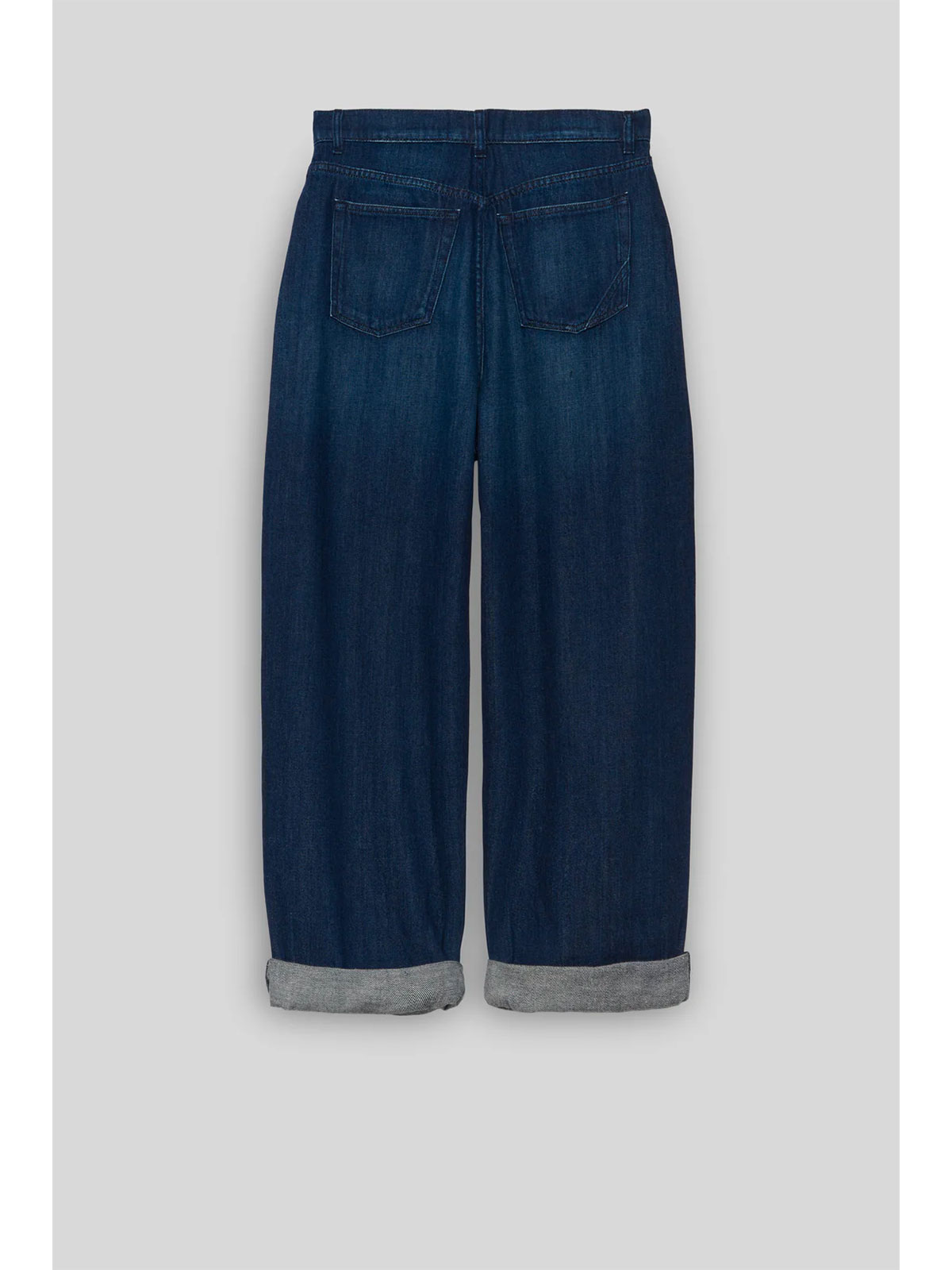 Jeans modello boyfriend a vita alta , fit rilassato, con gamba ampia, più stretta sul fondo e dettaglio risvolto. Lavaggio denim blu.