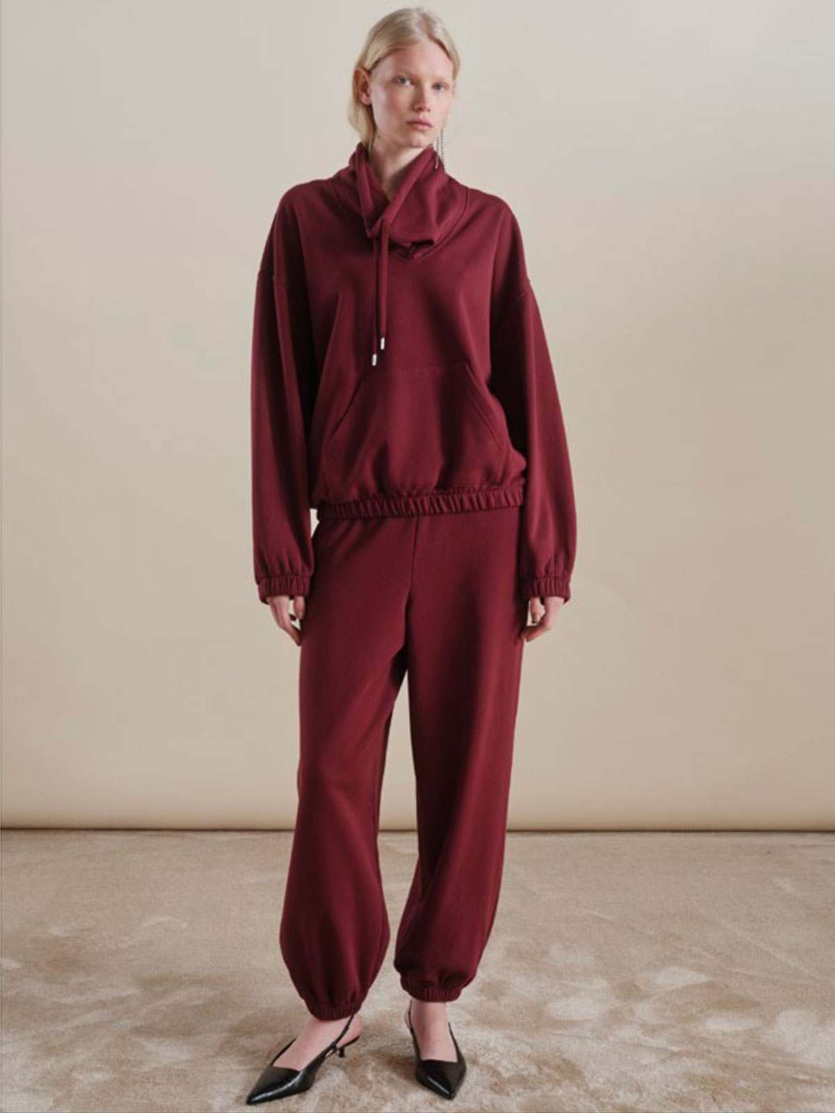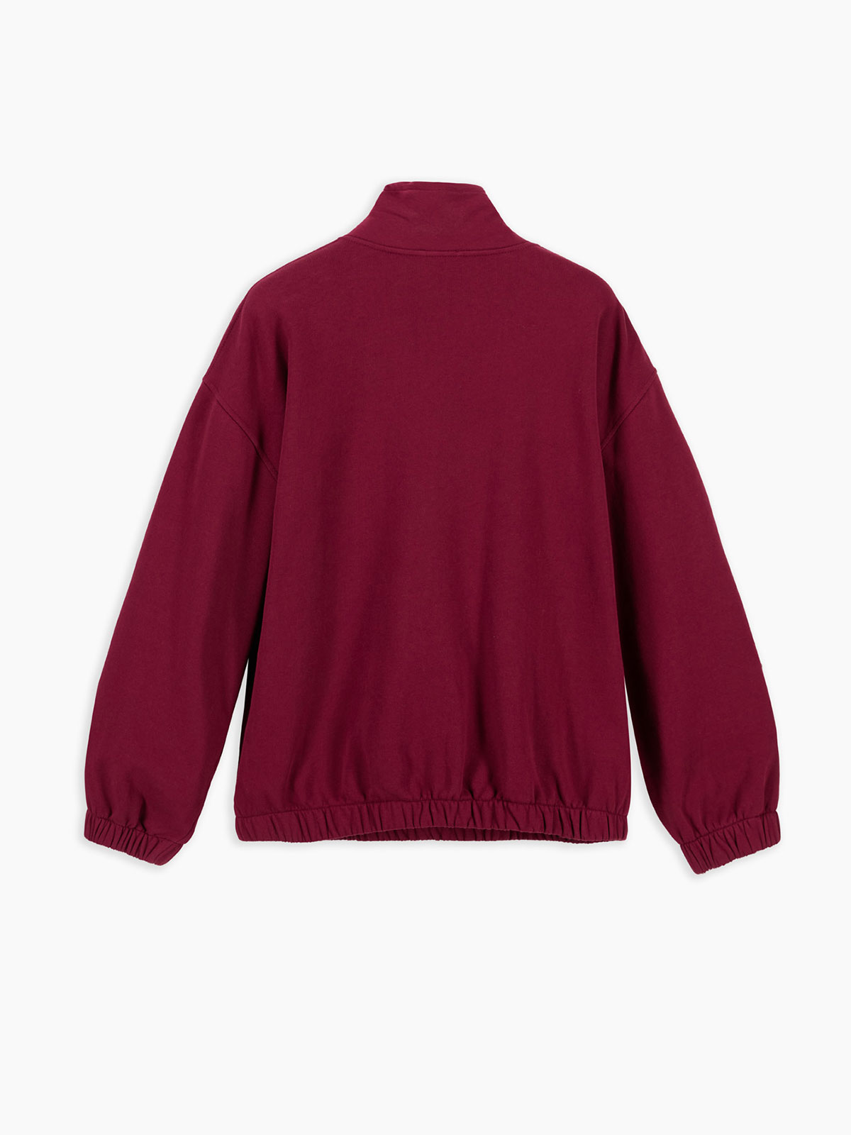 Felpa a manica lunga con collo in piedi con coulisse, elastici sui polsi e sul fondo e maxi tasca applicata sul davanti. Vestibilità oversize.