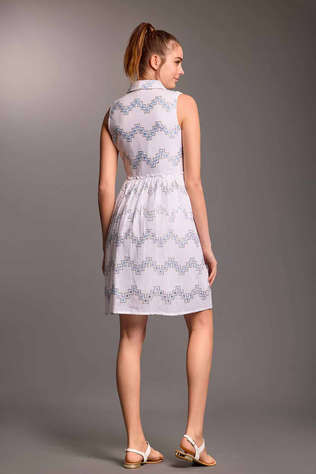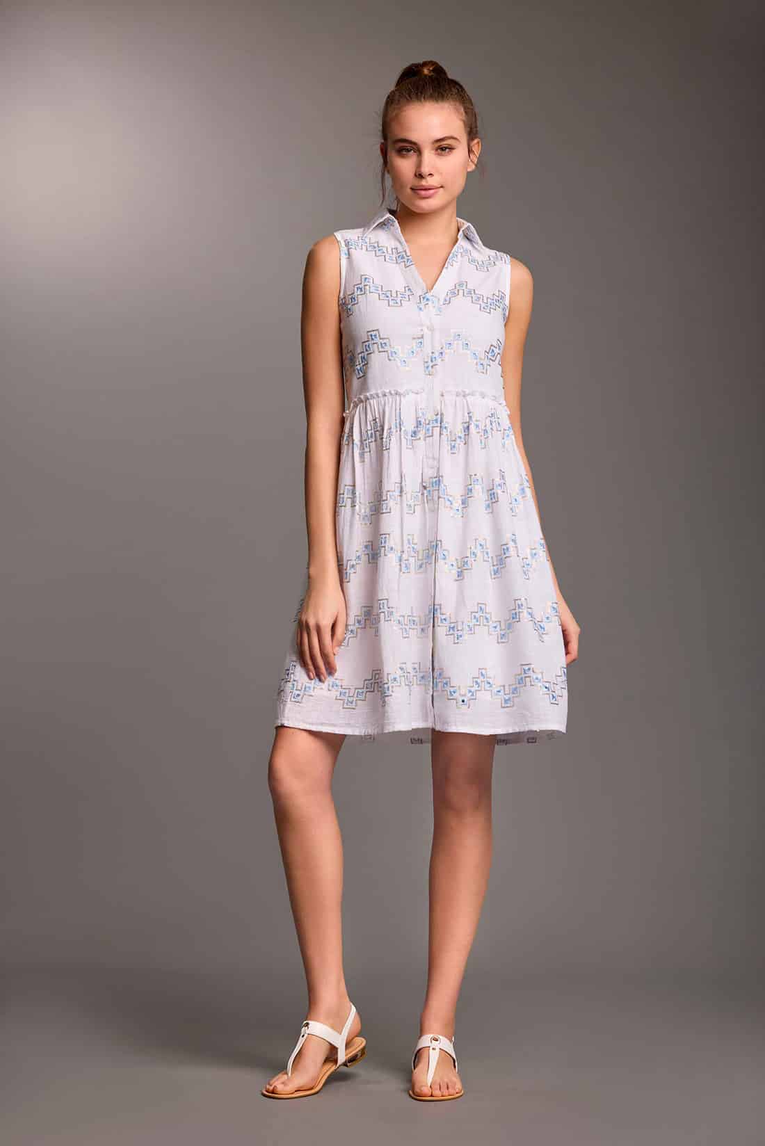 Completato con un colletto tradizionale, questo abito incarna lo spirito fresco e gioioso dell’estate, invitandoti a esplorare e divertirti con stile.