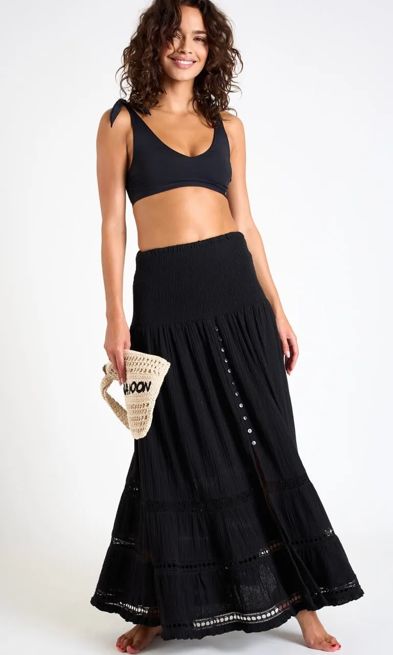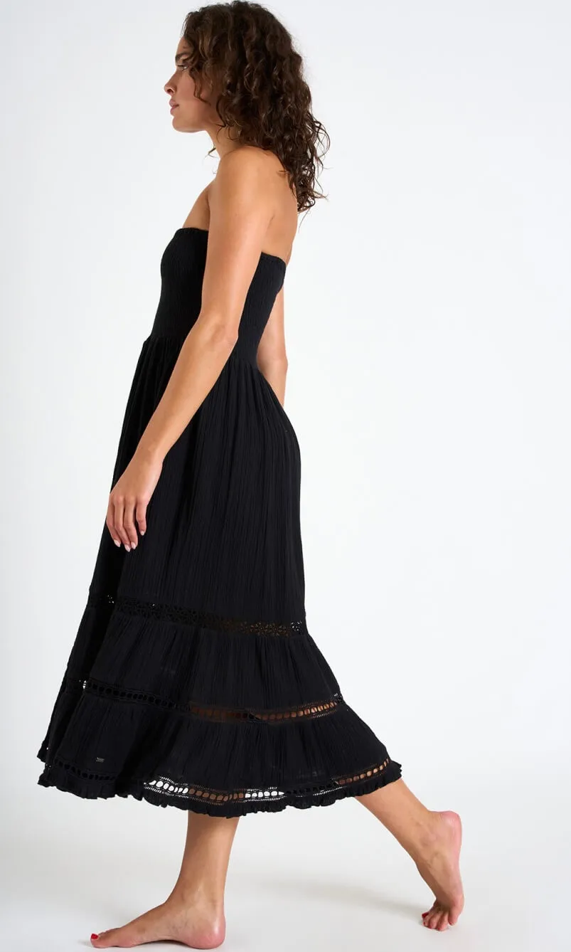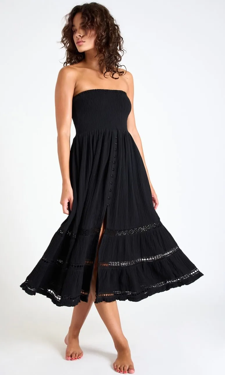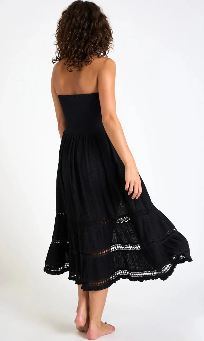 Lo charme mediterraneo incontra l’eleganza boho nell’abito lungo in viscosa naturale ultra-leggera, con corpetto smock elasticizzato e inserti in pizzo che accarezzano la figura; perfetto per chi cerca un look da vacanza esclusivo e sostenibile. Può essere indossato come abito con le spalle scoperte o come gonna lunga multiuso, rendendolo un capo estremamente versatile. Da abbinare a un sandalo flat per il giorno o a un gioiello dorato per la sera.