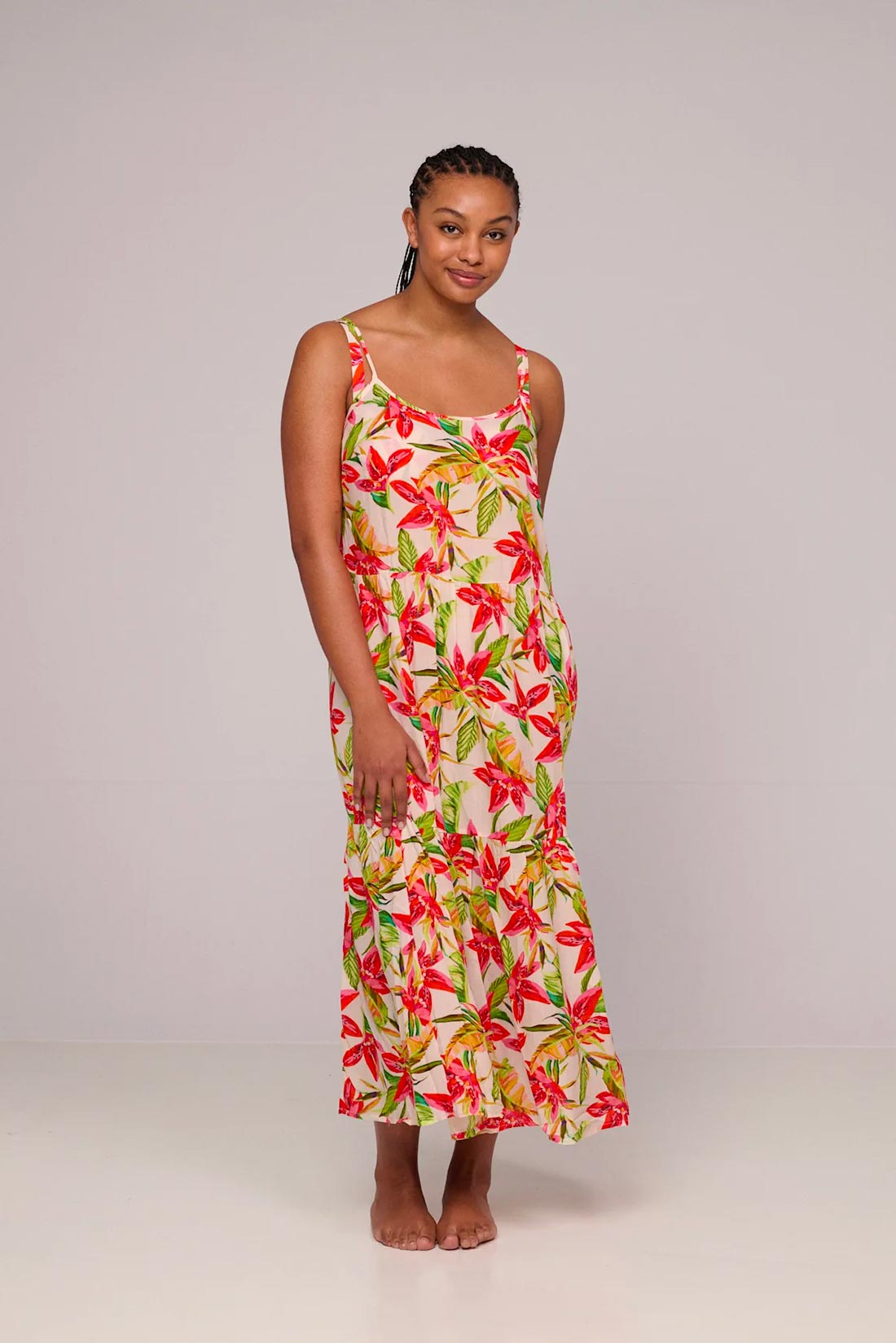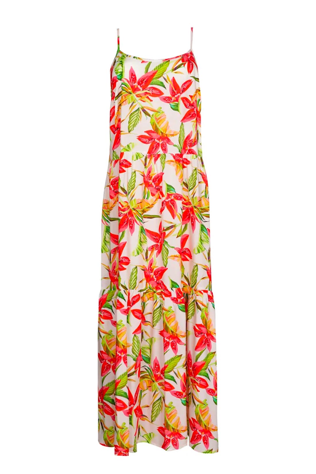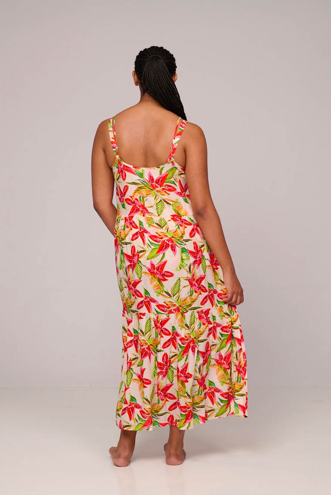 Caratteristiche: Abito lungo con balze Tortora in fantasia floreale colorata Lunghezza fino alle caviglie Spalline sottili regolabili Composizione e cura: 100% Viscosa Lavare a mano o con programma delicato, non candeggiare e non centrifugare. Si raccomanda di asciugare all’ombra. Per maggiori informazioni sul prodotto contattare il numero Whatsapp 0362238044 !