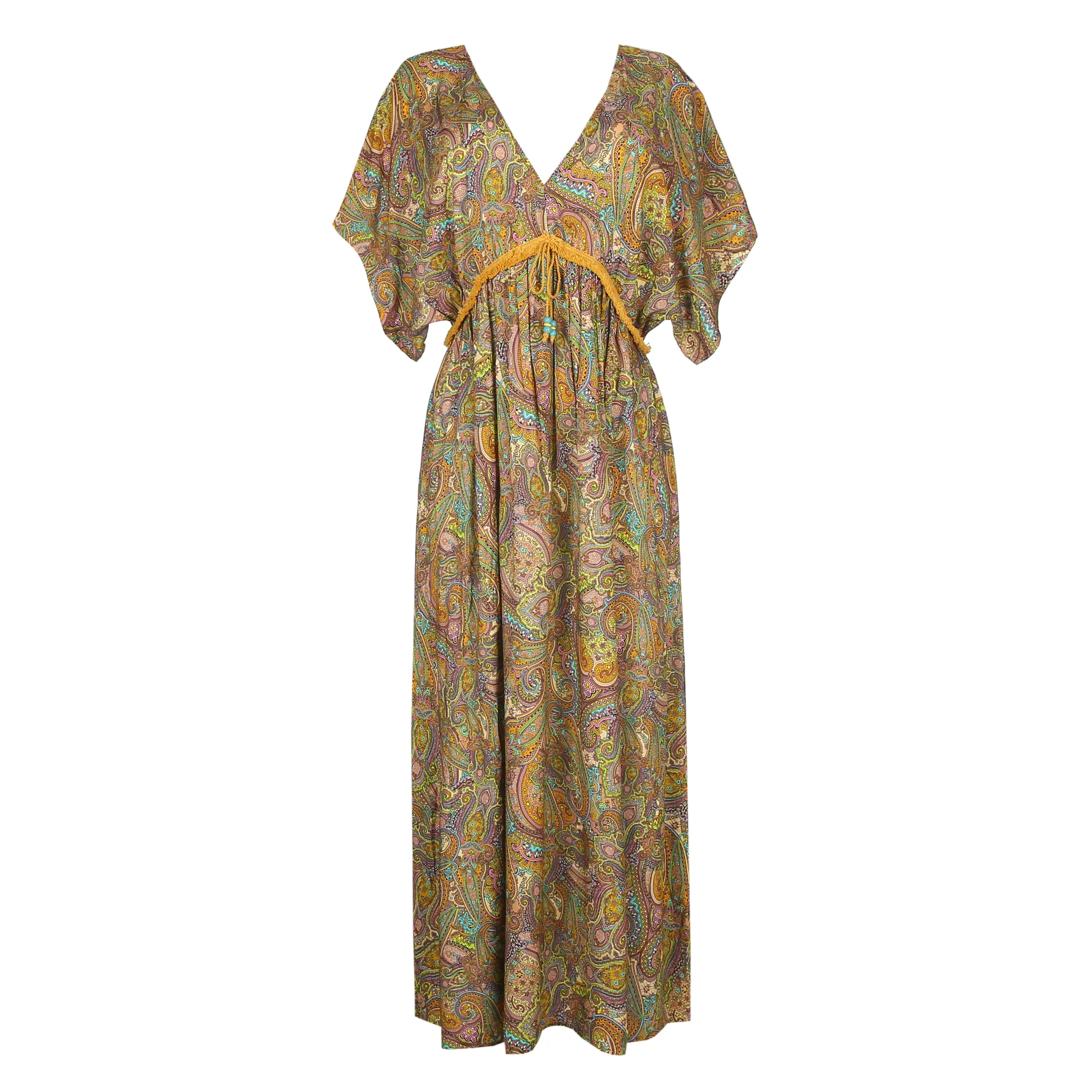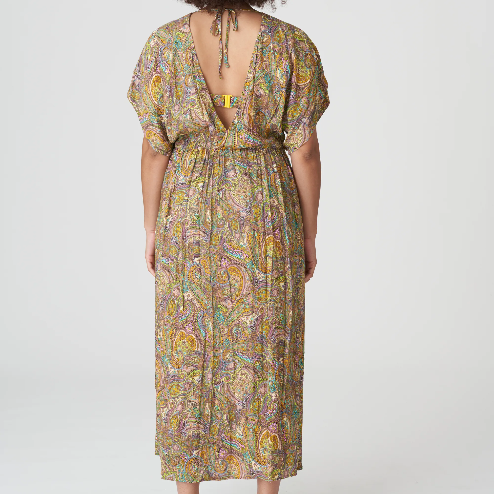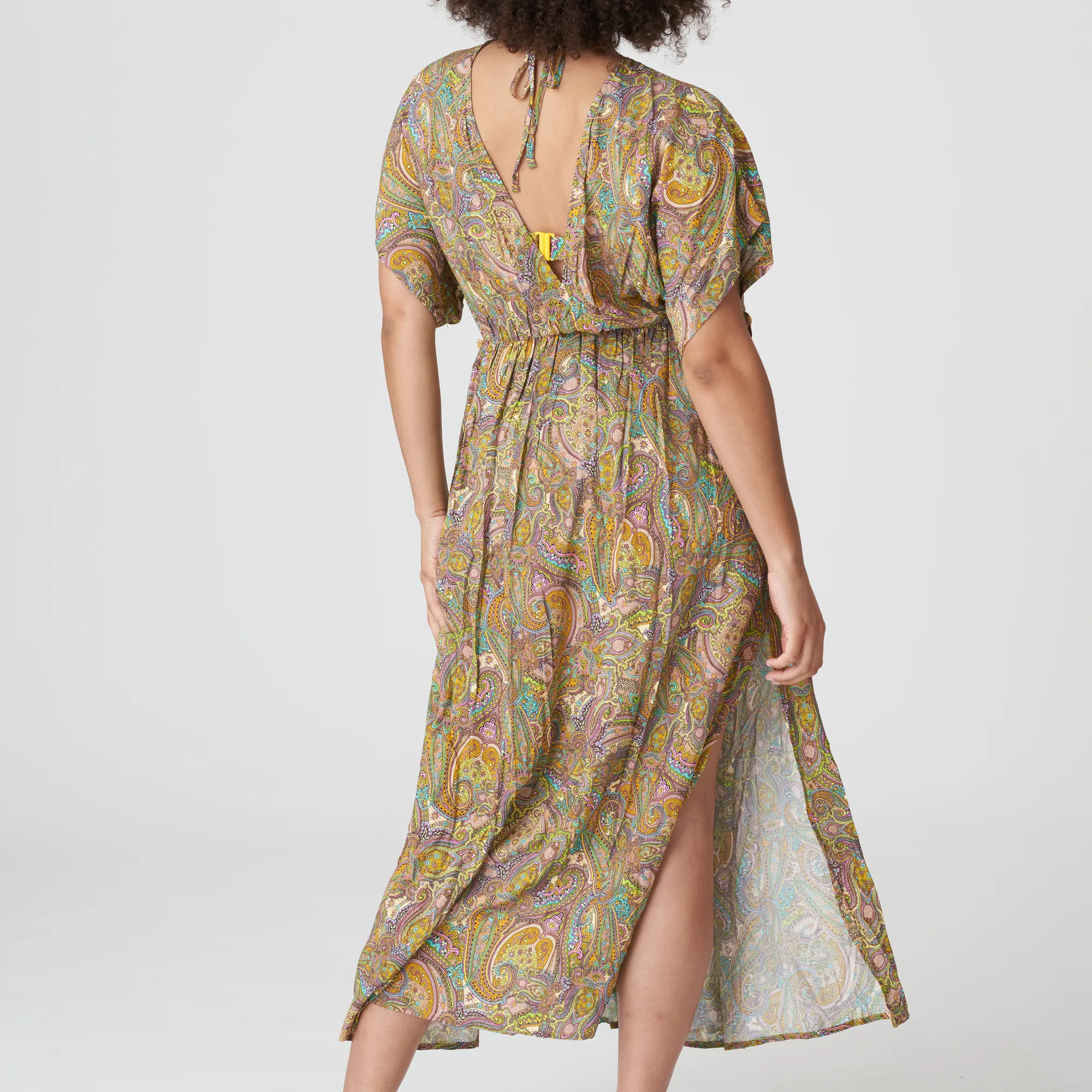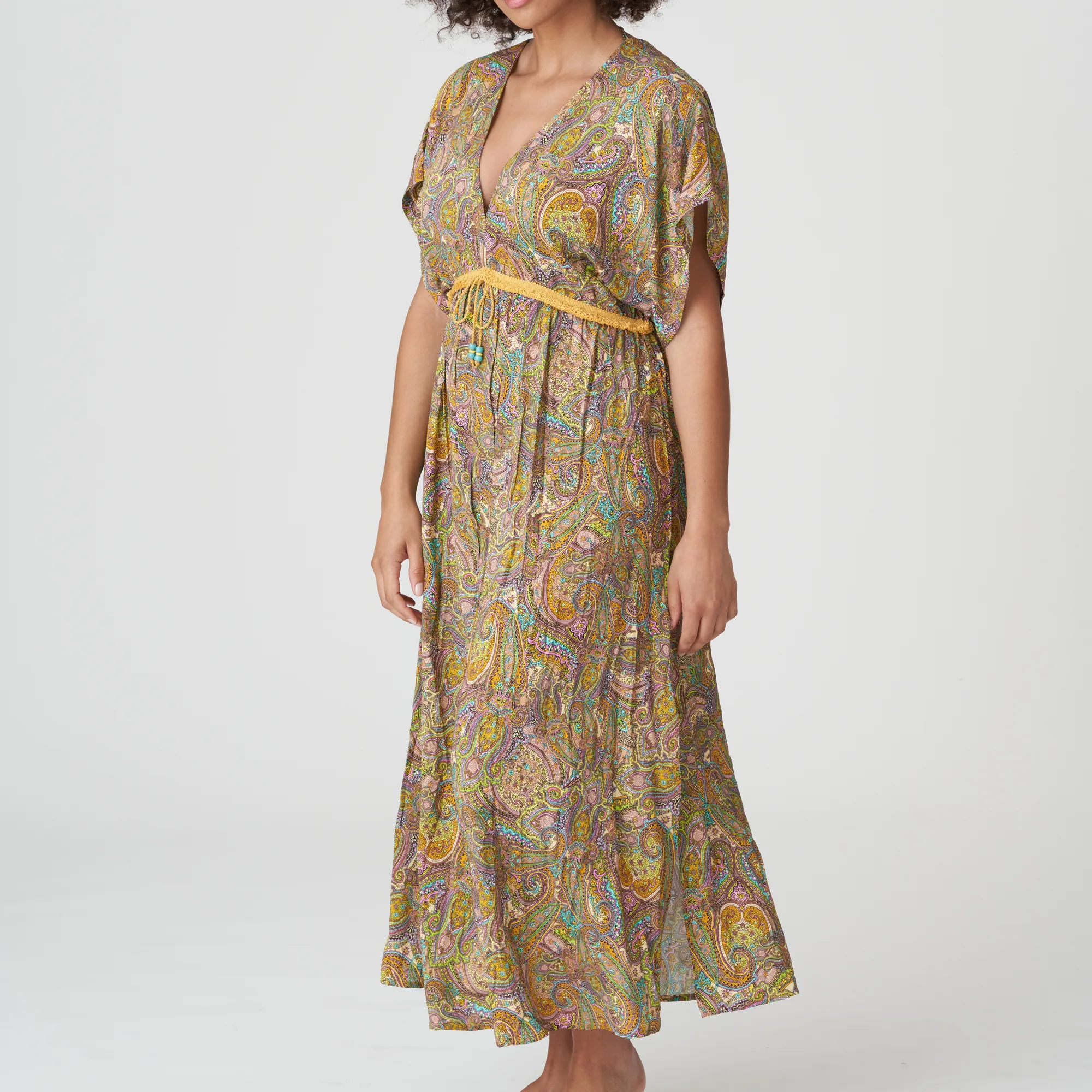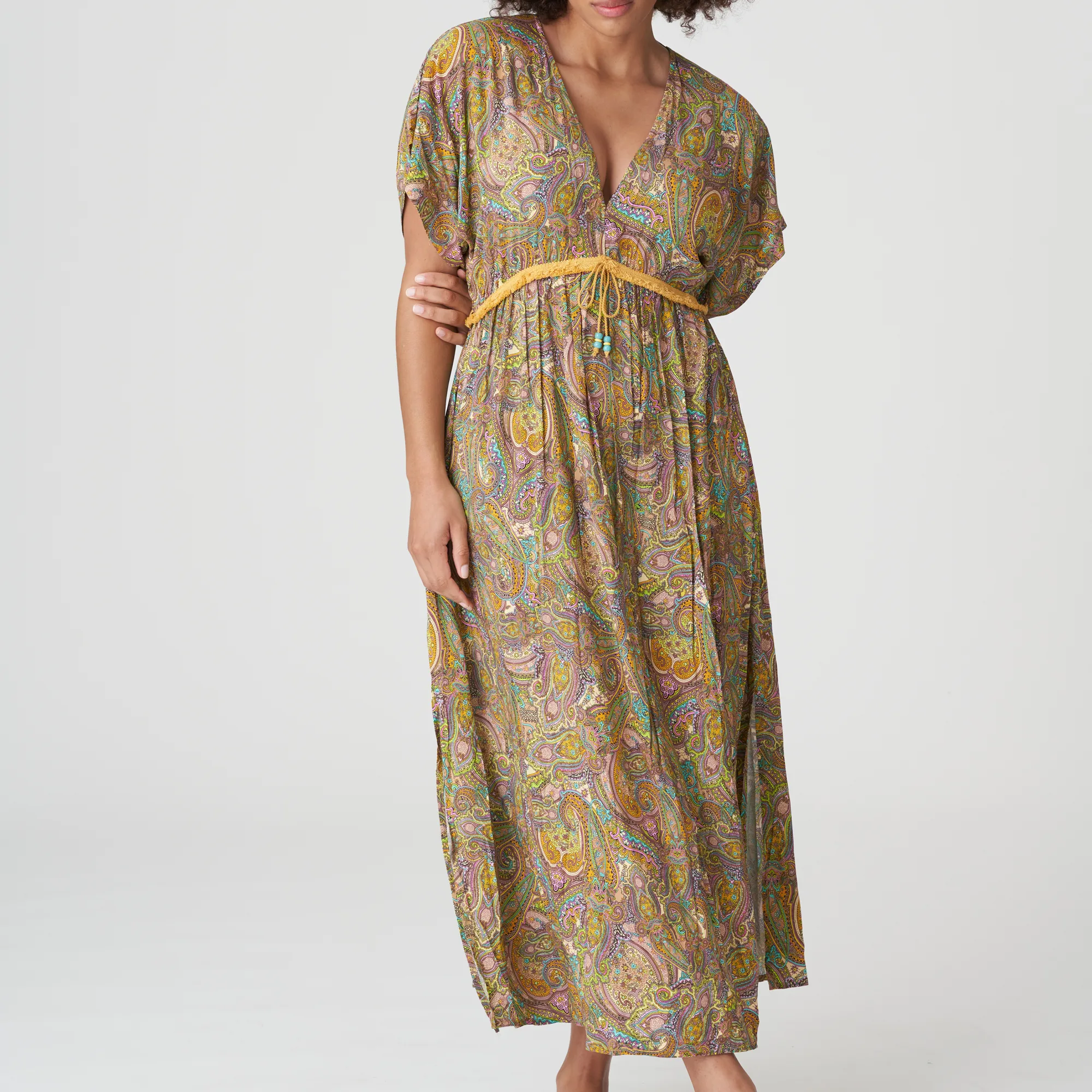 Abito lungo PrimaDonna Sakarun è realizzato in motivo Paisley in un colorato mix estivo. Beachwear ampio e confortevole in viscosa leggera e morbida, modello a stile impero con scollo a V e con taglio sotto seno sfrangiato per valorizzare il punto vita. Impreziosito inoltre da due cordoncini sul davanti.