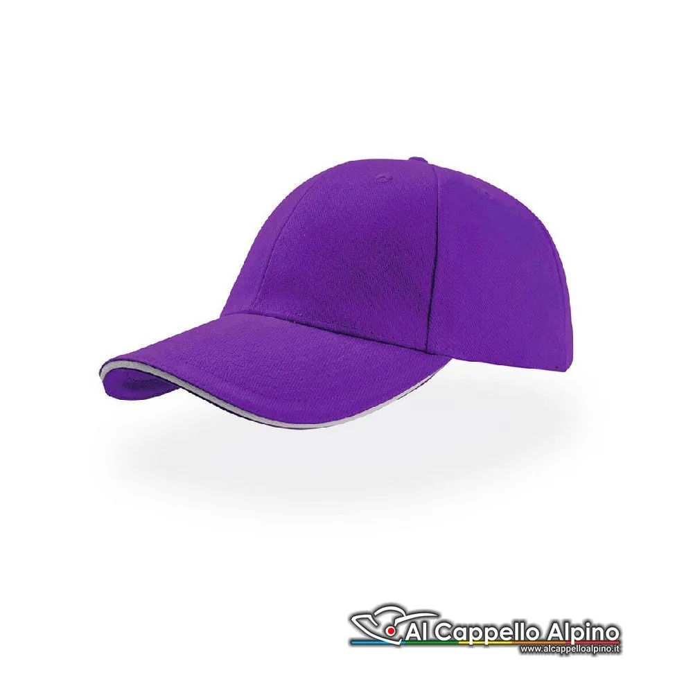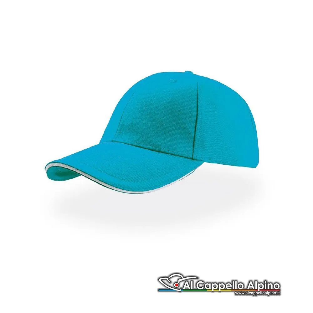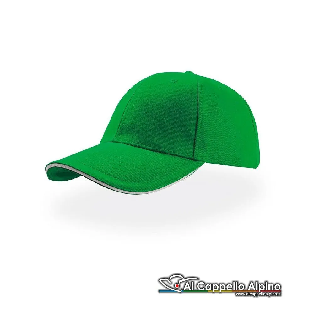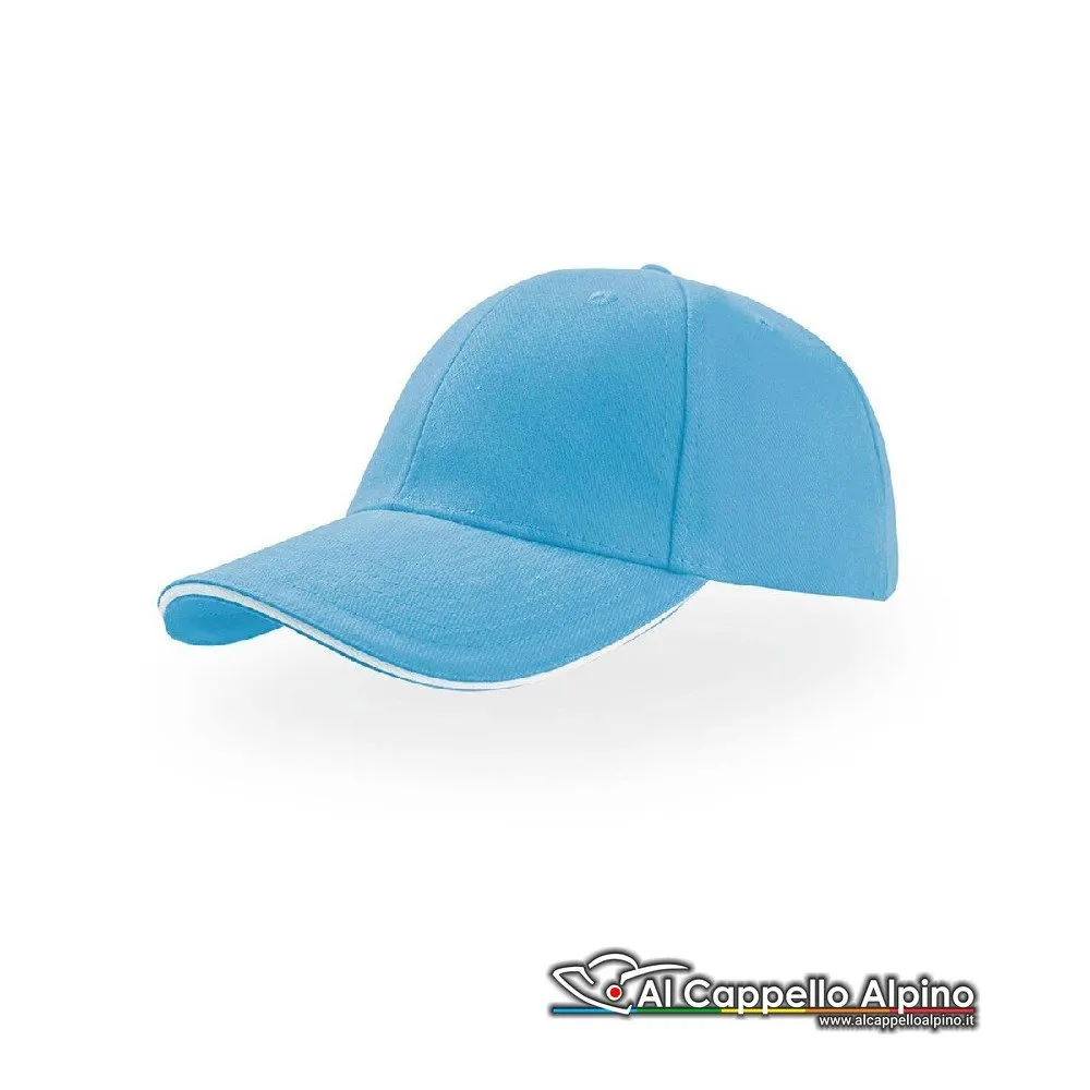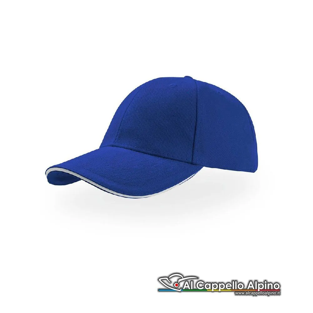 Berretto da Baseball Atlantis Liberty Sandwich 100% cotone. Cappellino a 6 pannelli visiera tipo sandwich con inserto a contrasto chiusura con cinturino passante su fibbia in metallo occhiello ricamato taglia unica.