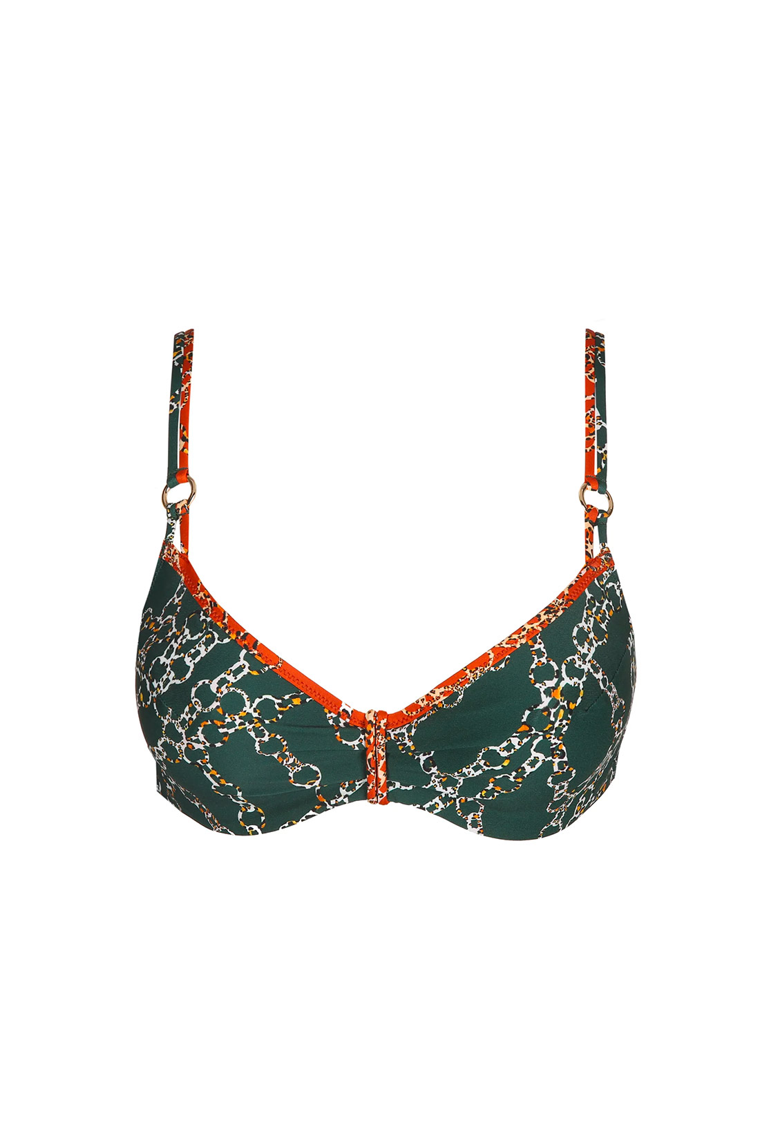 Caratteristiche: Bikini con ferretto In fantasia stampata con catene su base verdone Spalline multiposizione: dritte o incrociate sulla schiena Abbinato allo slip alto con coulisse regolabile Composizione e cura: Reggiseno: Polyamide:59%, Polyester:27%, Elasthanne:14% Slip: Polyamide:74%, Elasthanne:19%, Polyester:7% Lavare a mano o con programma delicato, rete di protezione consigliata, non candeggiare e non centrifugare. Si raccomanda di asciugare all’ombra. Completa il look: Abbinalo al suo kimono ! Per maggiori informazioni sul prodotto contattare il numero Whatsapp 0362238044 !