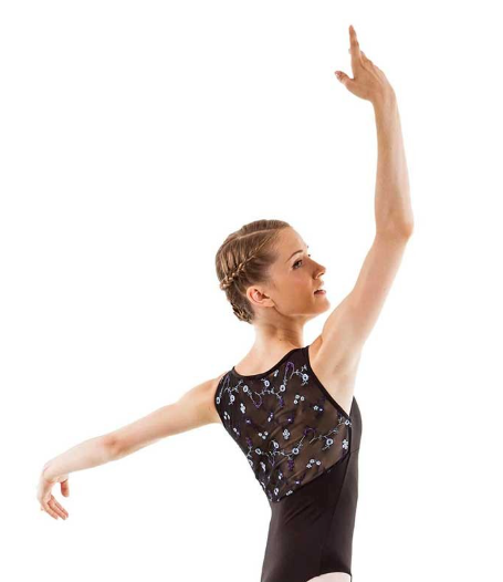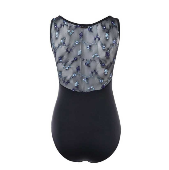 Il body Adassa, firmato K.H. Martin, presenta un scollatura a cuore sul fronte e questa schiena a rete con ricami floreali celesti/viola. Tessuto: 91% Meryl