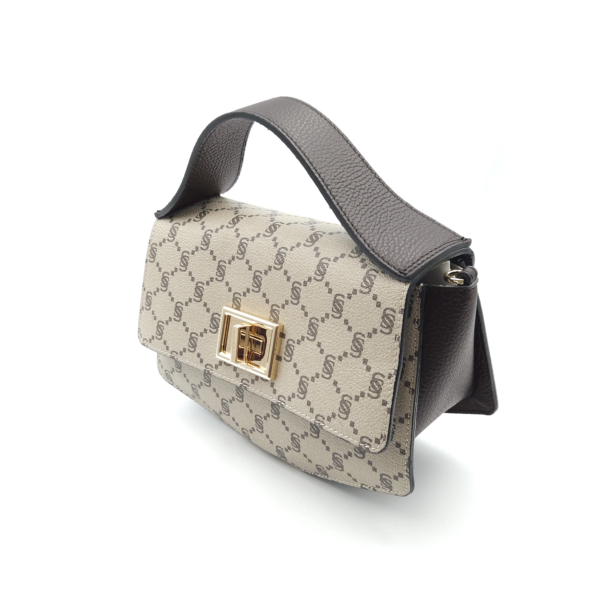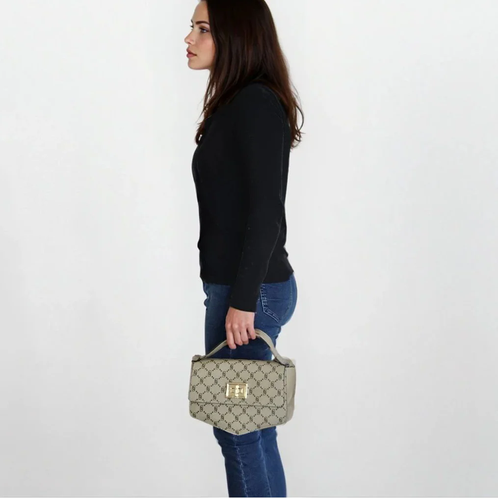 Un’elegante hand bag dal profilo compatto. La patta frontale con chiusura turn-lock in metallo dorato con incisione “i Santi” illumina il monogram mentre il manico corto e gli anelli laterali permettono di indossarla sia a mano sia a tracolla (inclusa).