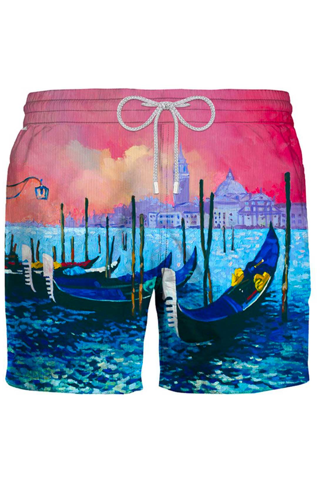La fantasia con un paesaggio veneziano aggiunge un tocco di originalità e divertimento al tuo look balneare, mentre il tessuto resistente al cloro e all’acqua salata assicura una durata eccezionale nel tempo. Inoltre, la protezione UV integrata ti protegge dai raggi solari.