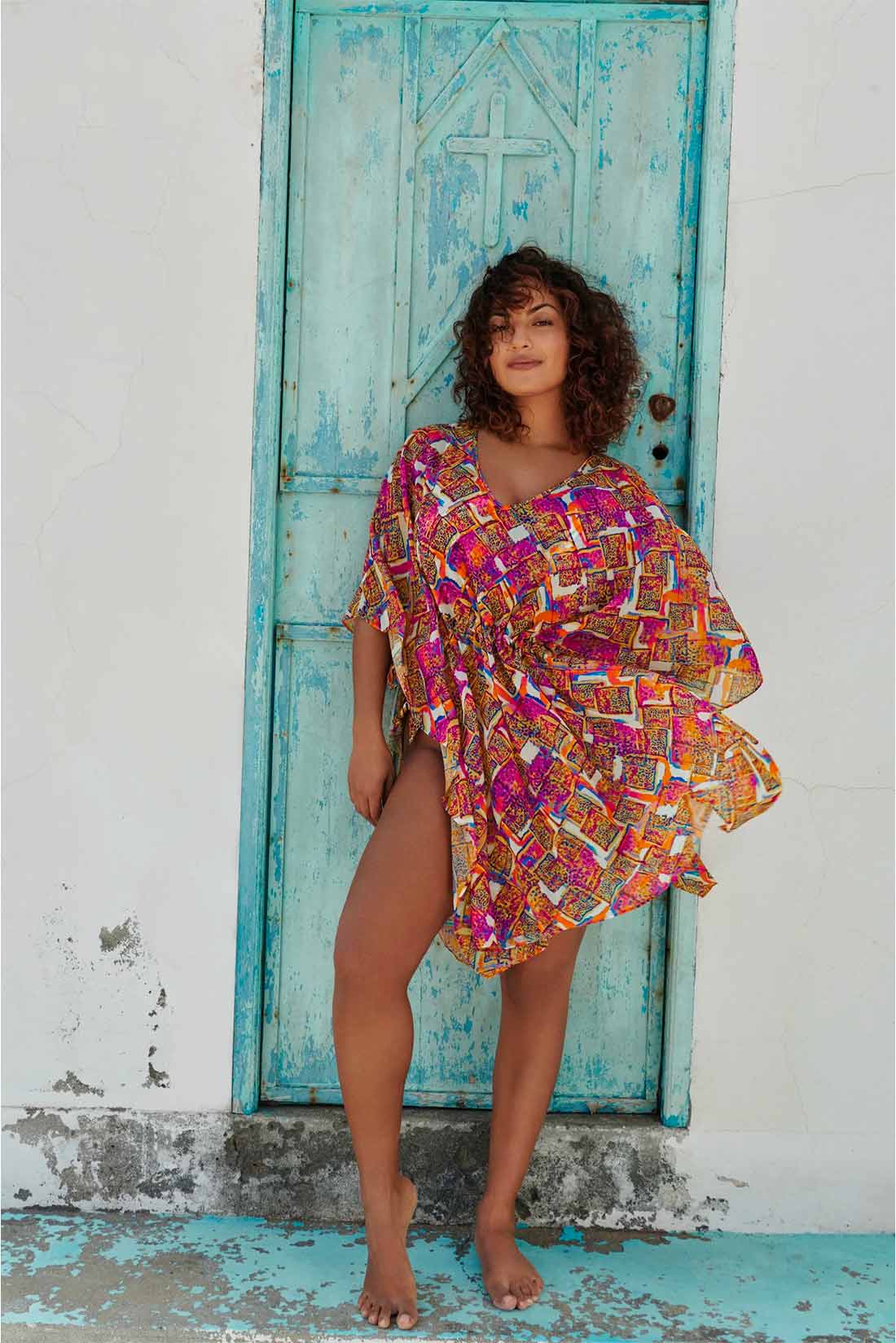 Il Caftano corto in fantasia Navalato Prima Donna è un capo versatile, caratterizzato da ampie maniche corte.