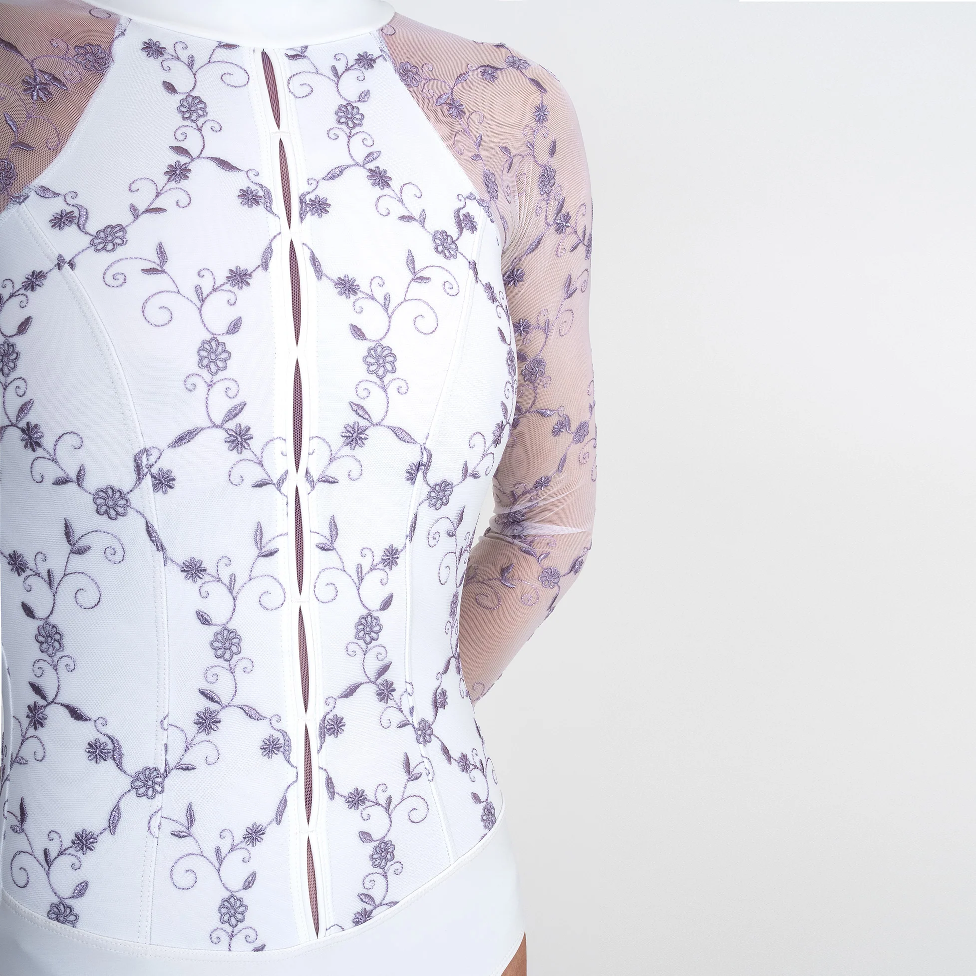 Dance leotard with long tulle sleeves with raglan cut and high neck collar. Each leotard is enriched with embroidered tulle and sartorial details. Crafted with the highest quality materials and attention to detail, these garments offer dancers the ultimate combination of comfort and style, with the option to add snap buttons to the gusset area.
