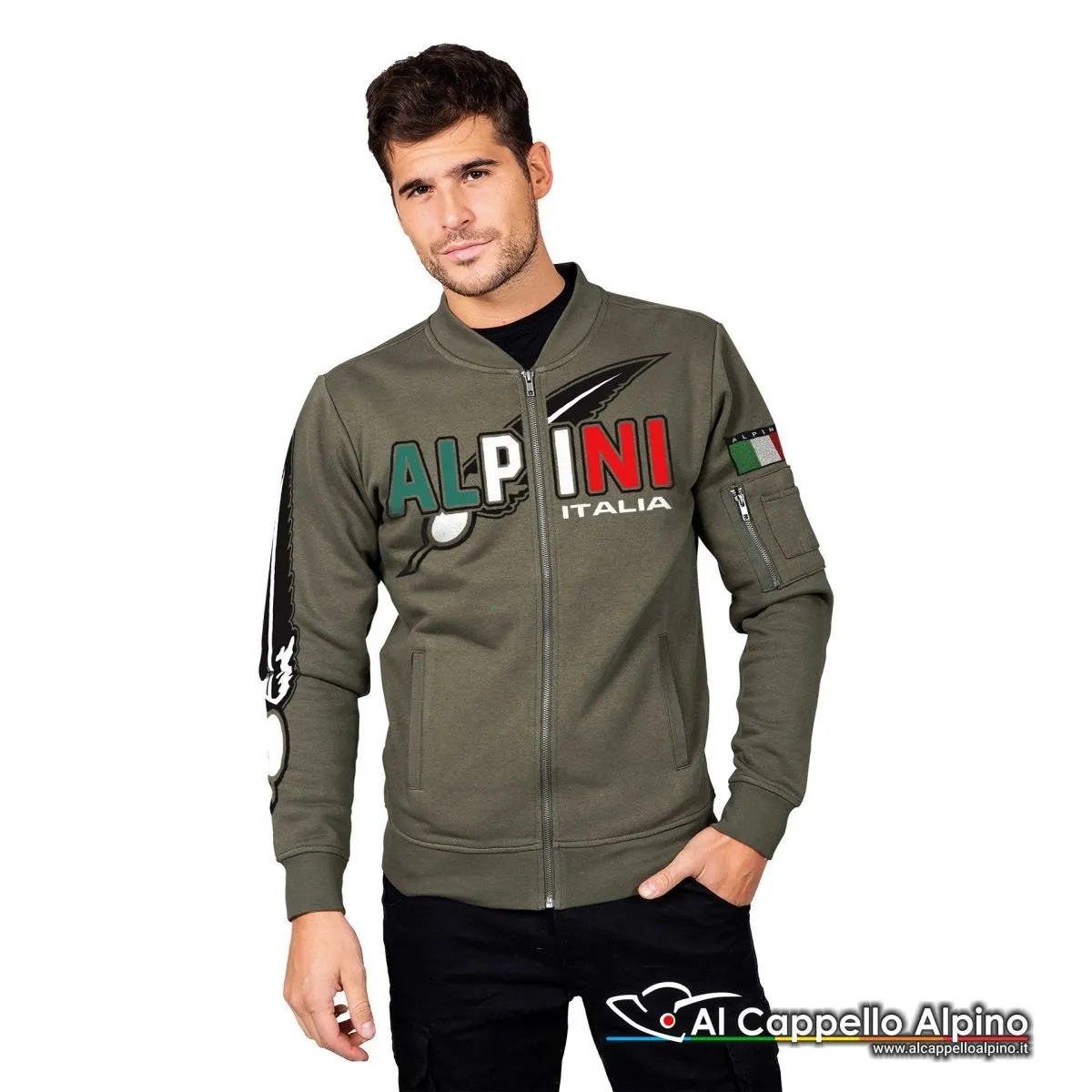 Felpa degli Alpini con stampa tricolore Stampa sul petto e sulle maniche Felpa 80% Cotone – 20% Poliestere Peso 280 g/m2 Colletto basso in costina elasticizzata Zip lunga in metallo Due tasche aperte a filetto Una tasca con zip sul braccio e due porta-bossoli Polsini e fondo maglia in costina elasticizzata Nastro di rinforzo interno collo Cuciture ribattute