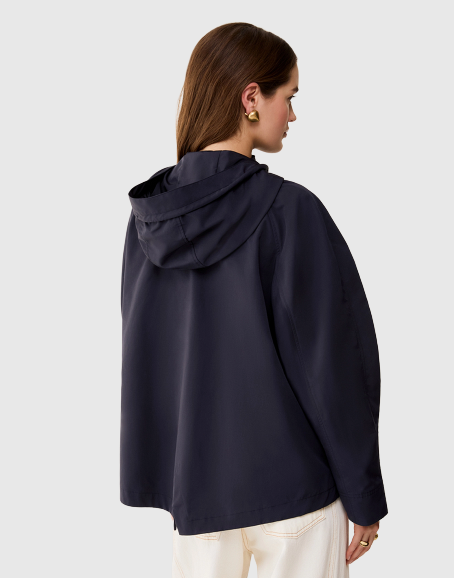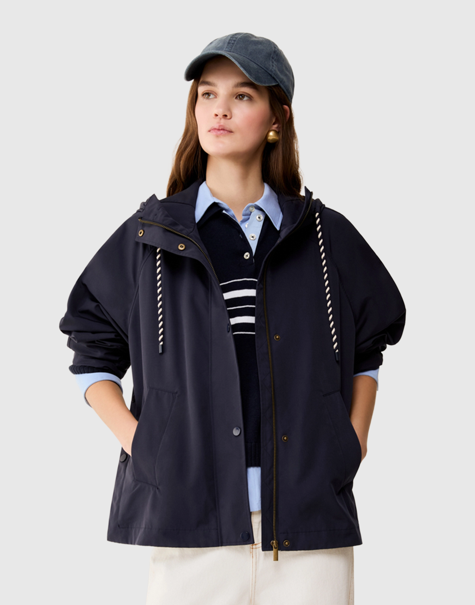 Praticità e stile in perfetta armonia: questa giacca risolverà sempre il look tra pioggerelle e brezze di mezza stagione. Tessuto tecnico in blend di cotone antigoccia Collo alto con cappuccio e coulisse con cordoncino ritorto Maniche a raglan Tasche a filo sul davanti Chiusura con zip nascosta e bottoni a pressione Spacchi a soffietto con bottoni a pressione ai fianchi Orlo arrotondato con spacchetto a V sul retro Capo sfoderato Fit ampio