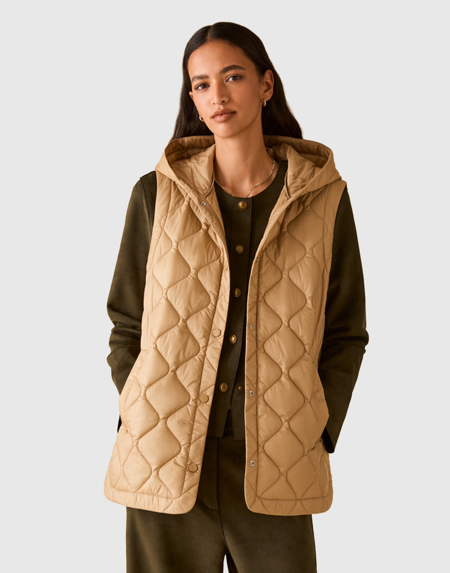 Pratico e versatile, questo gilet imbottito si porta sia in piena vista, sia come strato interno per riscaldare trench, parka e cappotti. Un jolly nel guardaroba. Nylon tecnico antigoccia Imbottitura leggera Collo con cappuccio Tasche a filo sul davanti Spacchi laterali arrotondati Chiusura con bottoni a pressione Taglio diritto Fit regolare