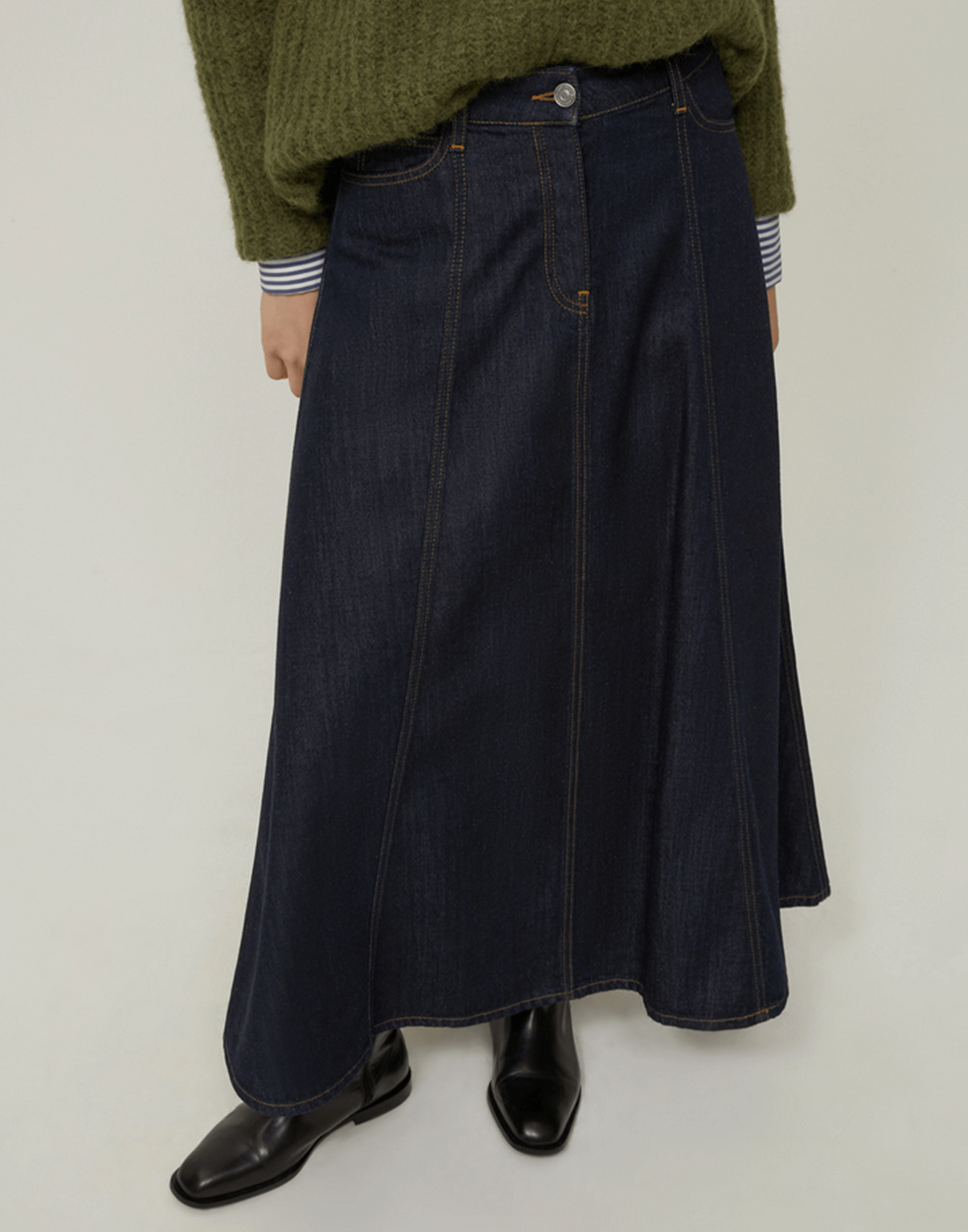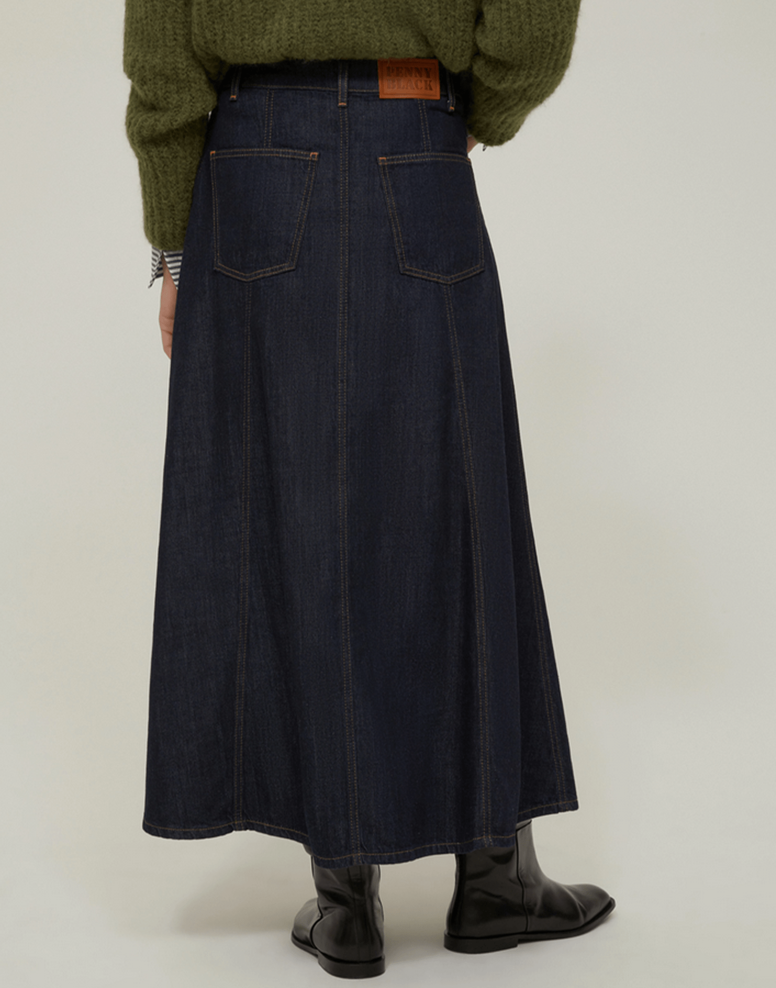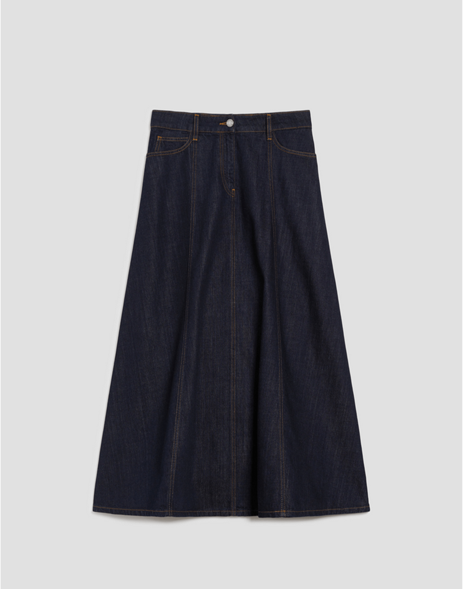 Carattere grintoso e silhouette chic, la gonna lunga in denim è la perfetta alleata dello stile quotidiano. Dettagli: Denim in cotone e lyocell Taglio svasato a pannelli Vita regolare con passanti Design cinque tasche Chiusura con zip nascosta e bottone Impunture a contrasto Capo sfoderato
