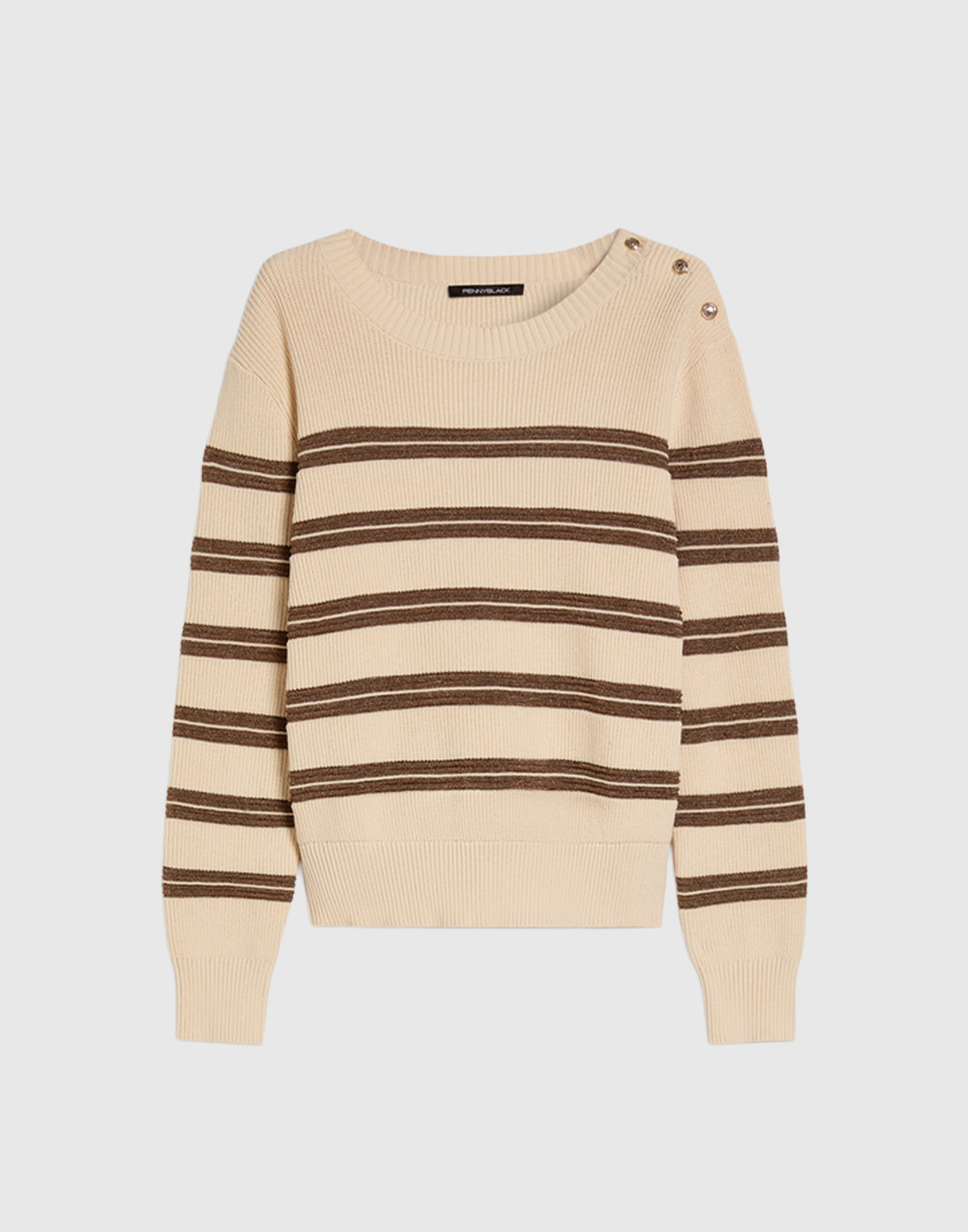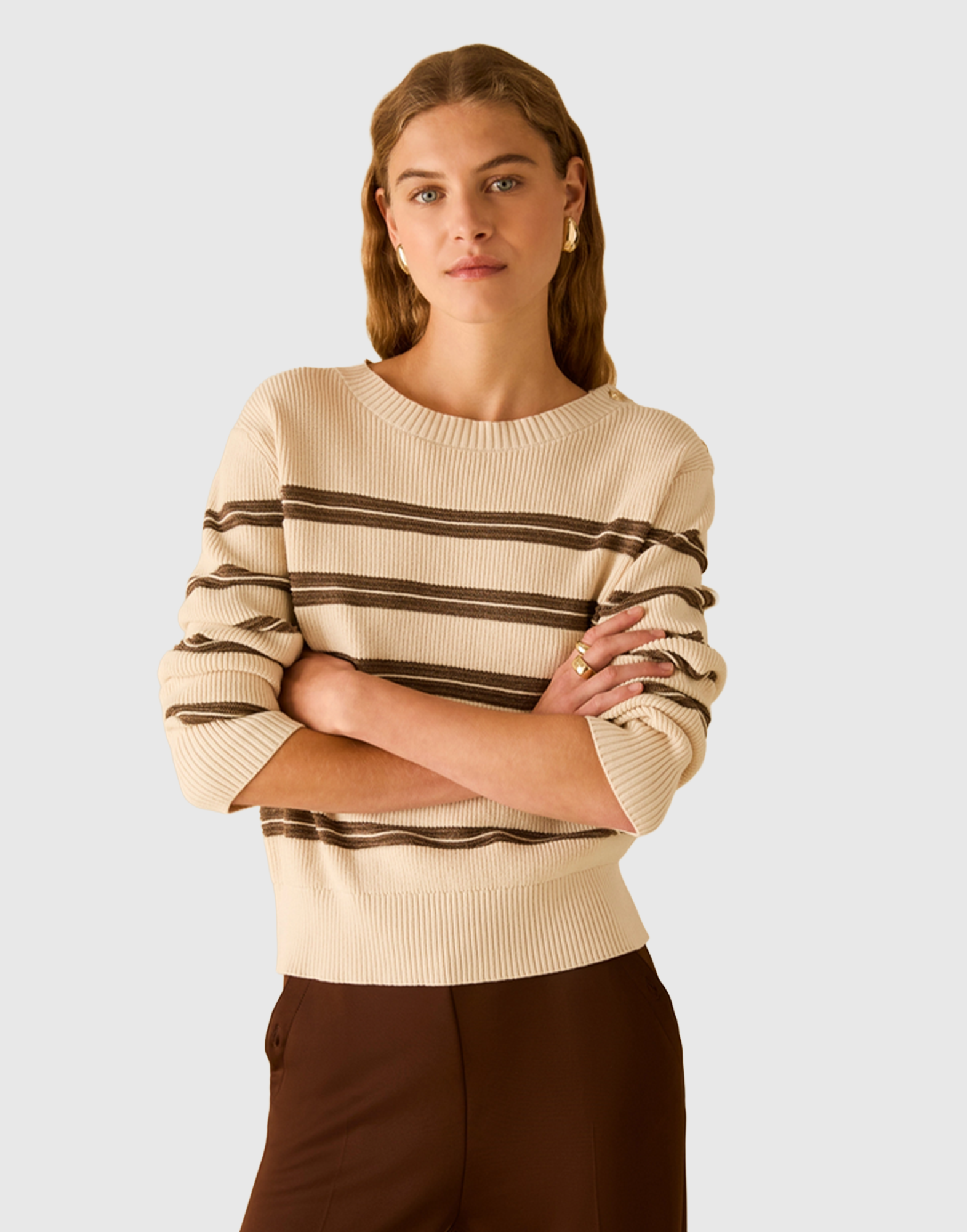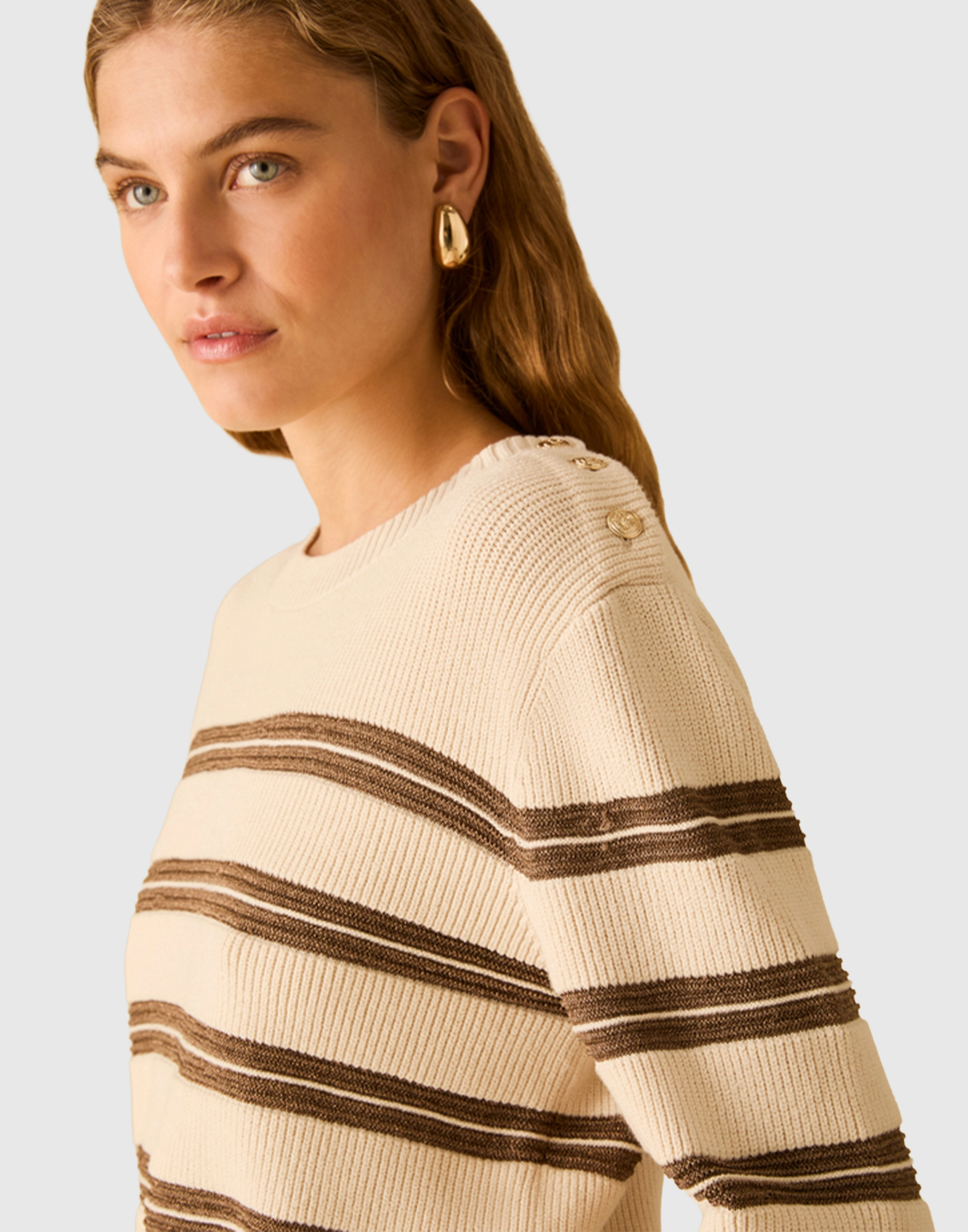 La maglia d’ispirazione marinière aggiunge un pizzico di glamour al suo fascino senza tempo, e accende le righe con riflessi scintillanti di lamé. Filato in misto cotone Lavorazione a punto pannocchia, bordi a costine Righe in filato lurex a punto links Girocollo, spalle leggermente scese, maniche lunghe Apertura con bottoni in metallo su una spalla Fit regolare