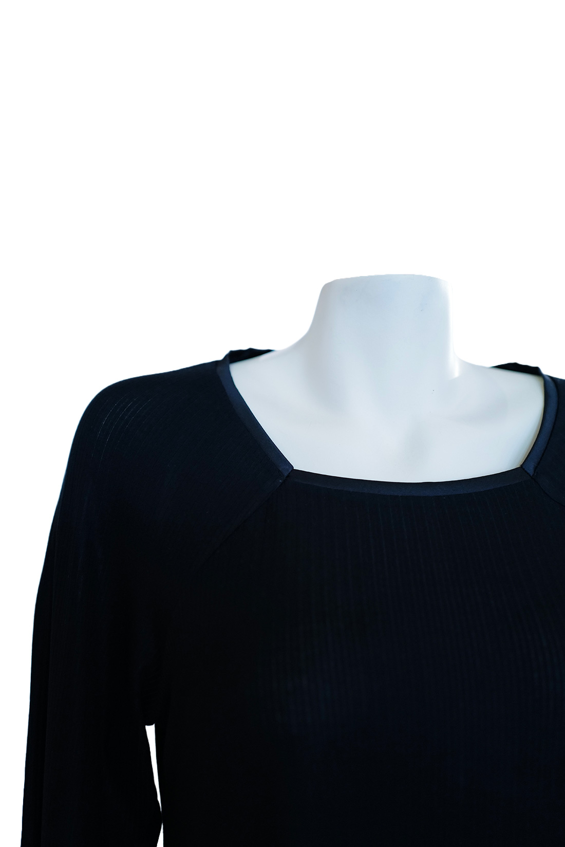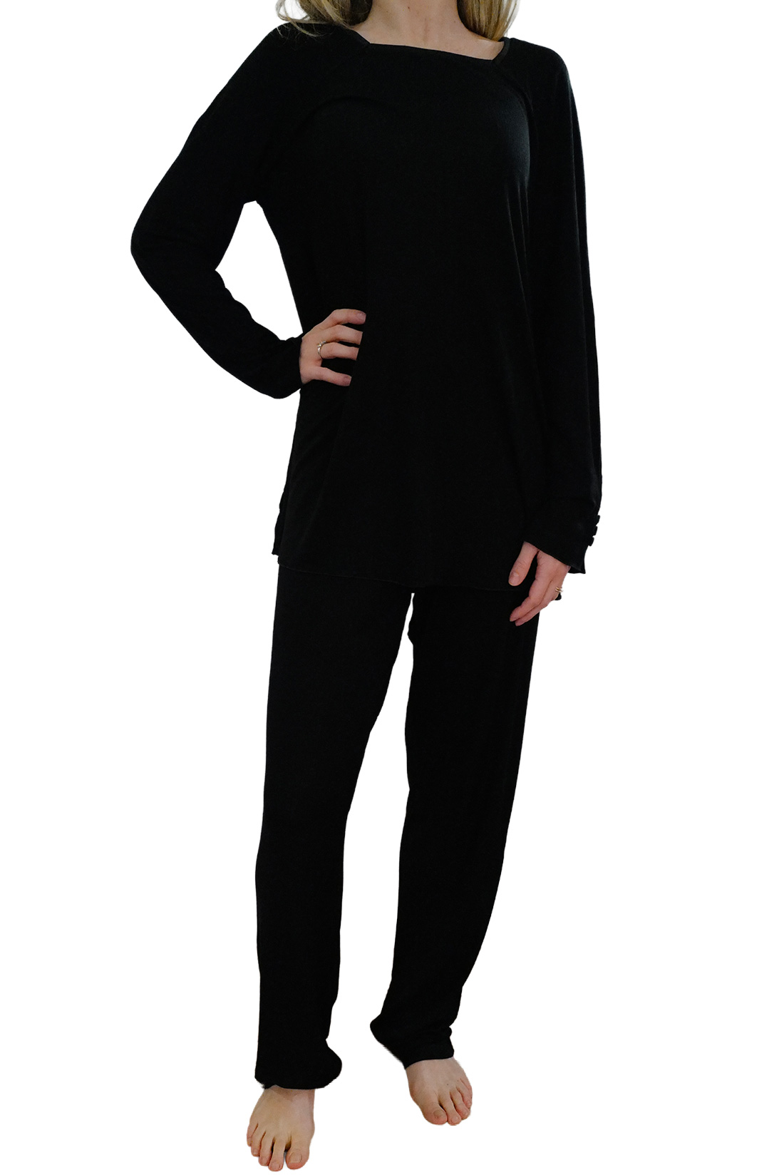 Caratteristiche: Maglia a maniche lunghe Scollo quadro con bordi in seta Tessuto a costine sottili Con bottoncini sulle maniche Pantalone senza polsini con elastico in vita Variante colore nero Composizione e cura: 93% Modal , 7% Elastane Lavare a mano o con programma delicato, non candeggiare e non centrifugare. Per maggiori informazioni sul prodotto contattare il numero Whatsapp 0362238044 !