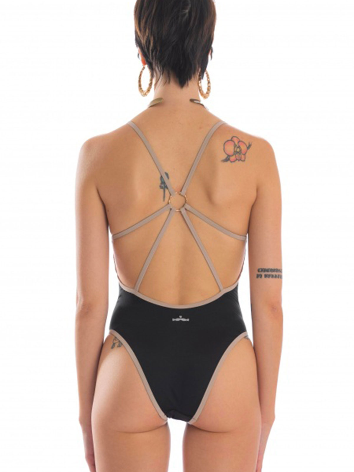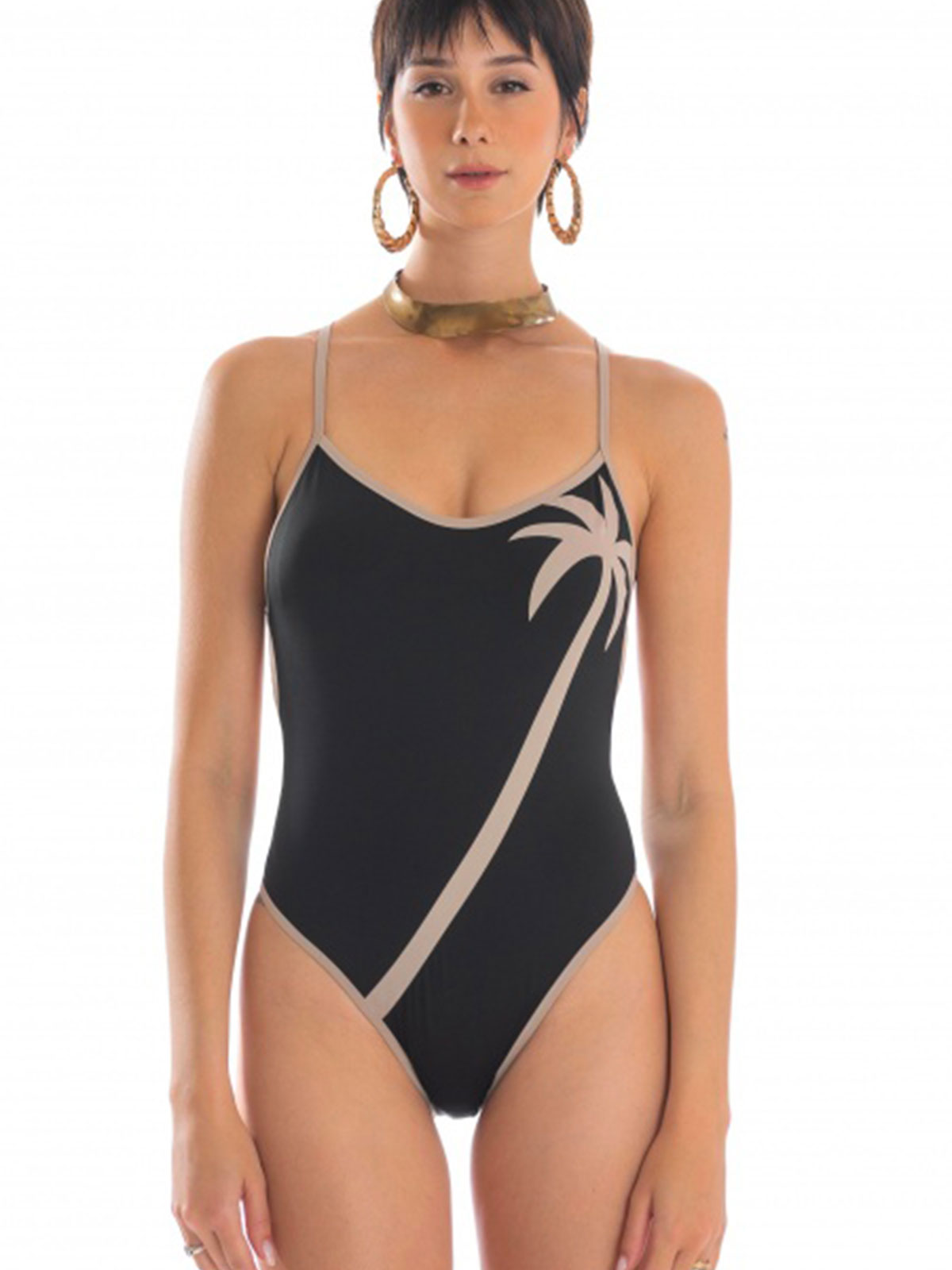 Costume da bagno intero con imbottitura estraibile in lycra nero profilato di beige con applicazione Palma.