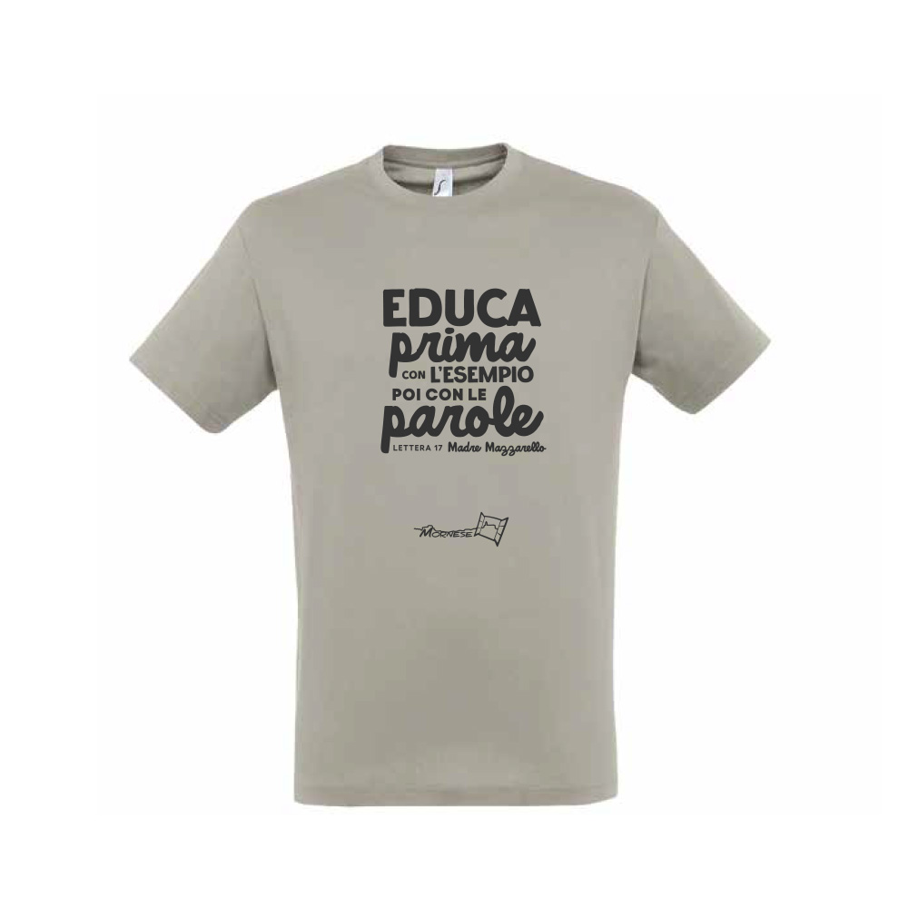 T-shirt grigia personalizzata FMA Mornese con la scritta “Educa prima con l’esempio poi con le parole – Lettera 17 Madre Mazzarello”
