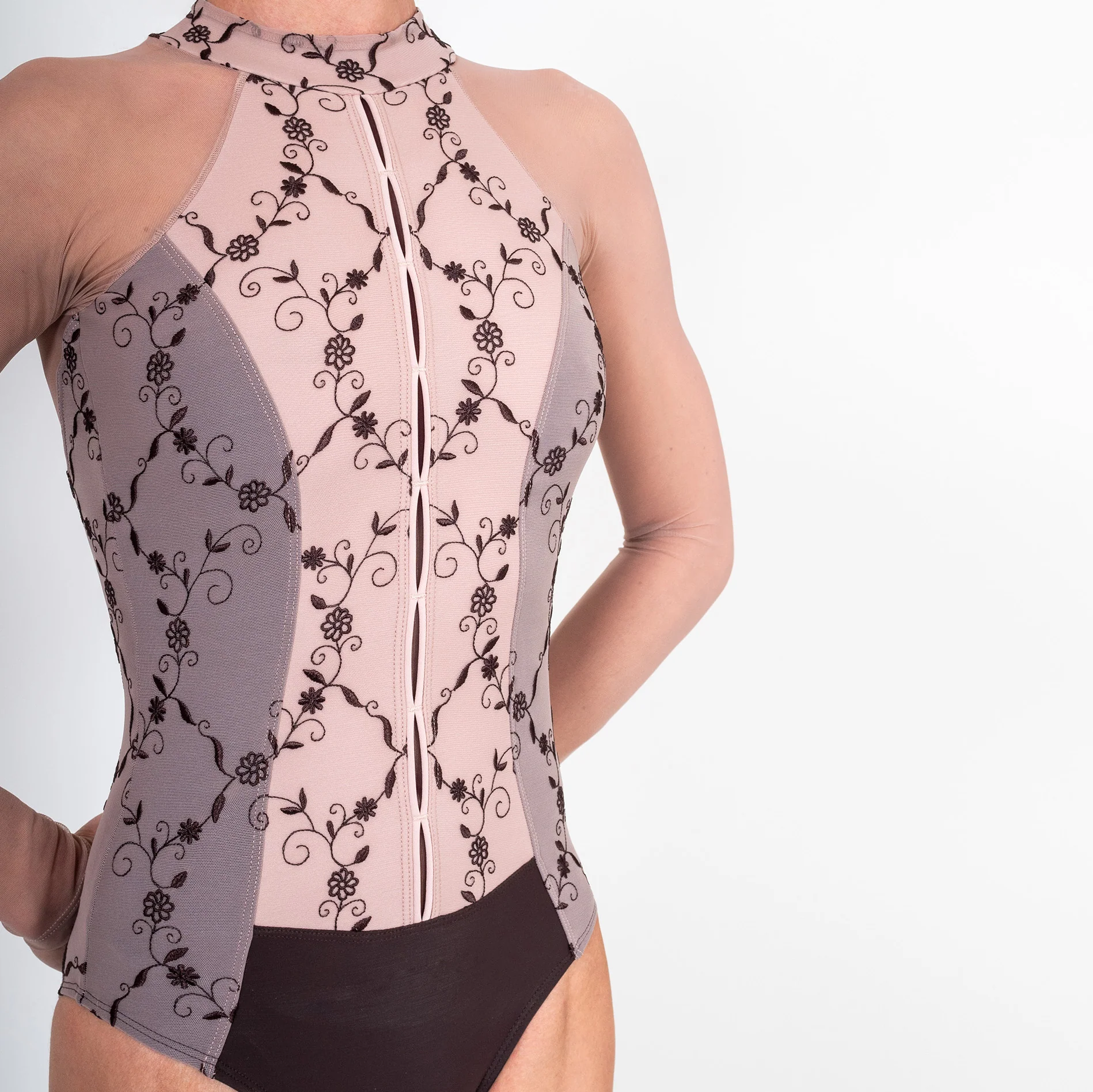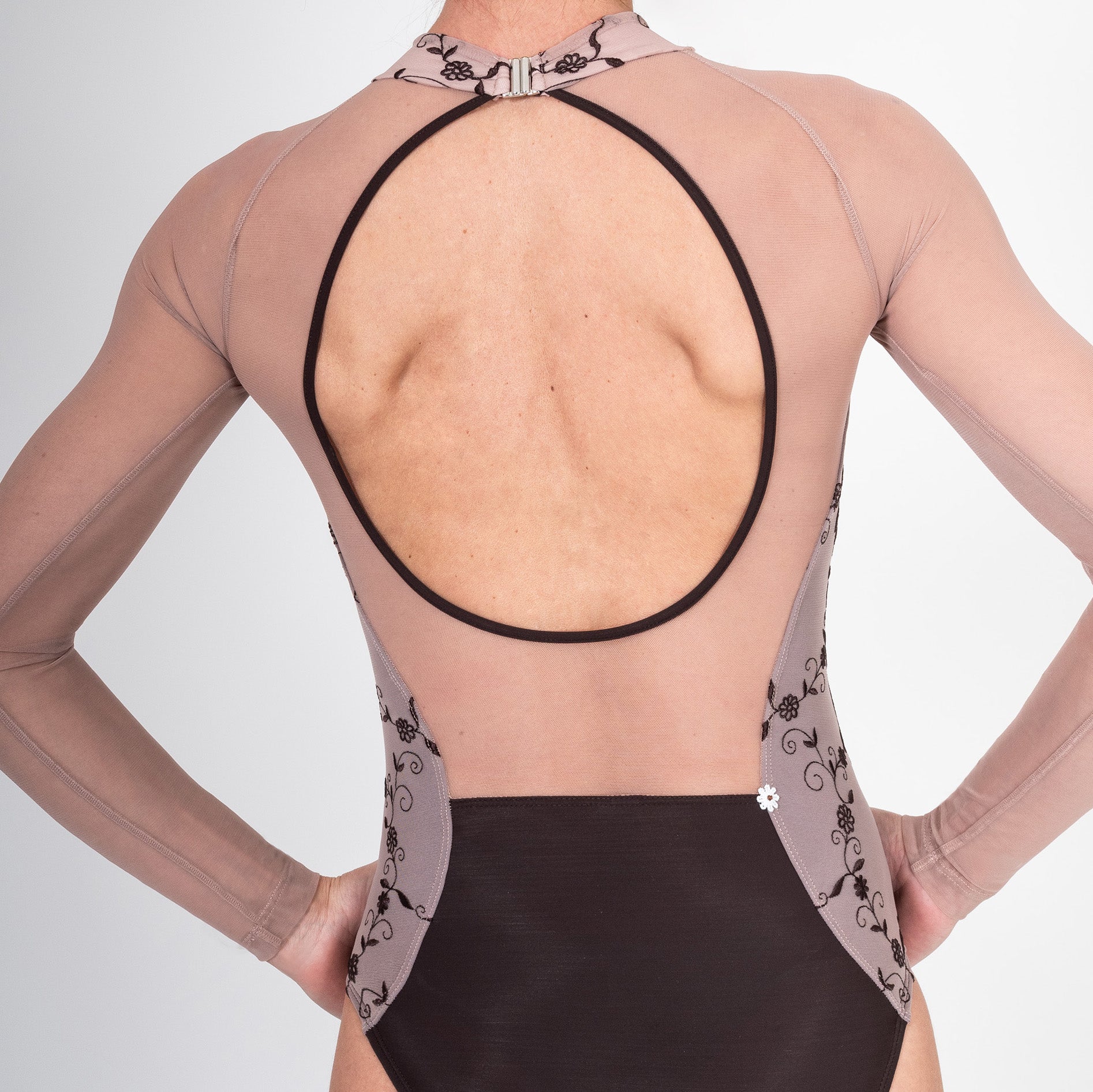 Dance leotard with long tulle sleeves with raglan cut and high neck collar. Each leotard is enriched with embroidered tulle and sartorial details. Crafted with the highest quality materials and attention to detail, these garments offer dancers the ultimate combination of comfort and style, with the option to add snap buttons to the gusset area.